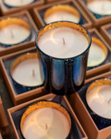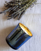 Mireille, is a natural Honey & Lavender scented organic candle in a mottled golden and night-blue glass.